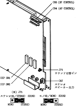 ステレオ出力にするには、図のジャンパー(JP1)をステレオ側にして、ステレオスピーカー出力用4Pコネクター(CN7)からスピーカーに配線して下さい。
