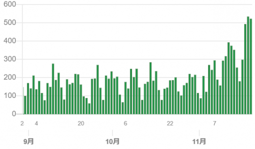 テレビでよく見るやつです。9月から10月まで100-200人前後だったのが、11月に入って右肩上がりに増えていってます。ここ3日間は500人前後と、数字だけ見ると油断できない数になっています。経済活動が本格化し始めていることや、gotoイベントによるものなのか、色々原因はあるでしょうけど、今までの国民の努力でも広がる時は広がる、ということを示しています。それでもがんばらなきゃいけないんでしょうね。